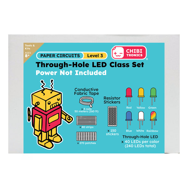 Designed for classroom and group learning, the Chibitronics Through-Hole LED Class Set (Not Powered) introduces students to advanced circuit concepts through paper crafting and hands-on exploration. Custom-cut LED legs make prototyping and polarity identification easy. The Through-Hole LED Class Set contains enough supplies for up to 40 students.
