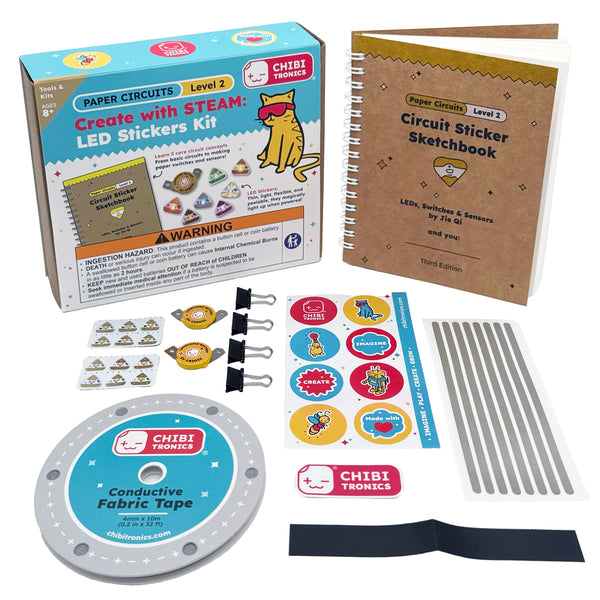 Our Create with STEAM: LED Circuit Sticker Kit includes the newest edition of our Circuit Sticker Sketchbook! This all-inclusive kit (recommended for ages 8+) offers a deeper dive into paper circuits, including instruction on the use of switches, sensors, and LED stickers.