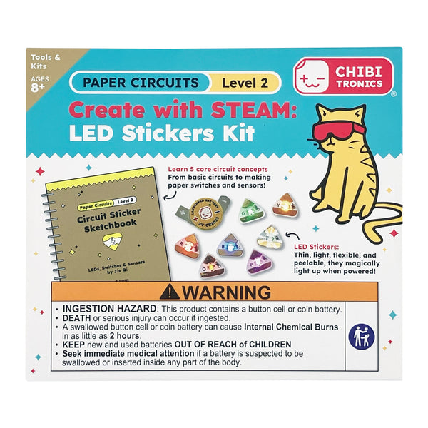 CREATE WITH LIGHT – Learn about circuits in a fun and creative way with the Chibitronics Create with STEAM: LED Stickers Kit. The included Circuit Sticker Sketchbook guides you through five core circuit concepts and hands-on activities to make your own light-up drawings.